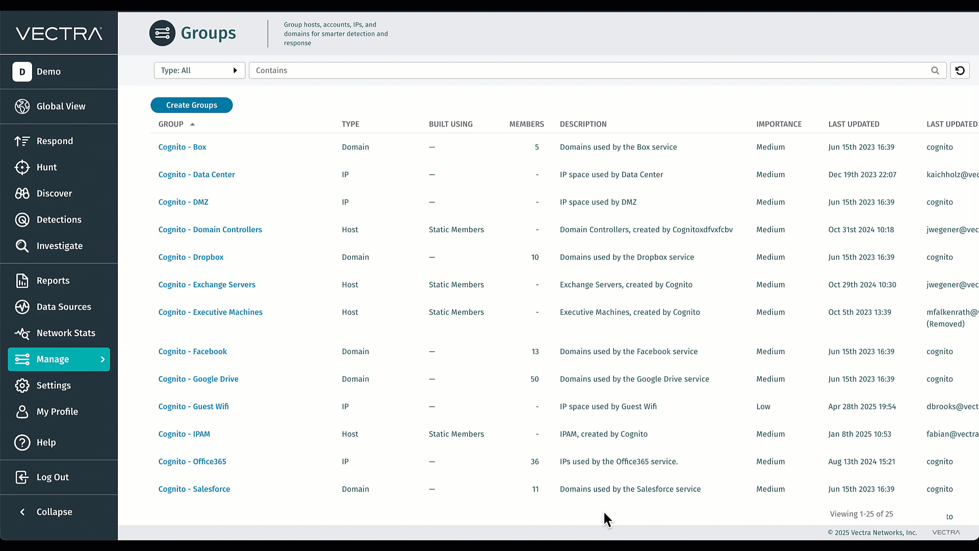 A partir de la version 9.0, Vectra AI supporte désormais les groupes dynamiques sur l'UX Quadrant. Les groupes dynamiques sont une fonctionnalité de la plateforme Vectra AI qui permet aux clients d'utiliser des règles Regex pour définir quels hôtes ou comptes doivent appartenir à chaque groupe de triage, ce qui permet de trier automatiquement les entités dans les groupes au fur et à mesure qu'elles sont détectées. Cette fonctionnalité réduira le temps que les clients consacrent à la gestion et à la mise à jour des groupes. La prise en charge de cette fonctionnalité par Respond UX a été introduite en décembre 2024. Pour plus d'informations, voir : https://support.vectra.ai/s/article/KB-VS-1839.