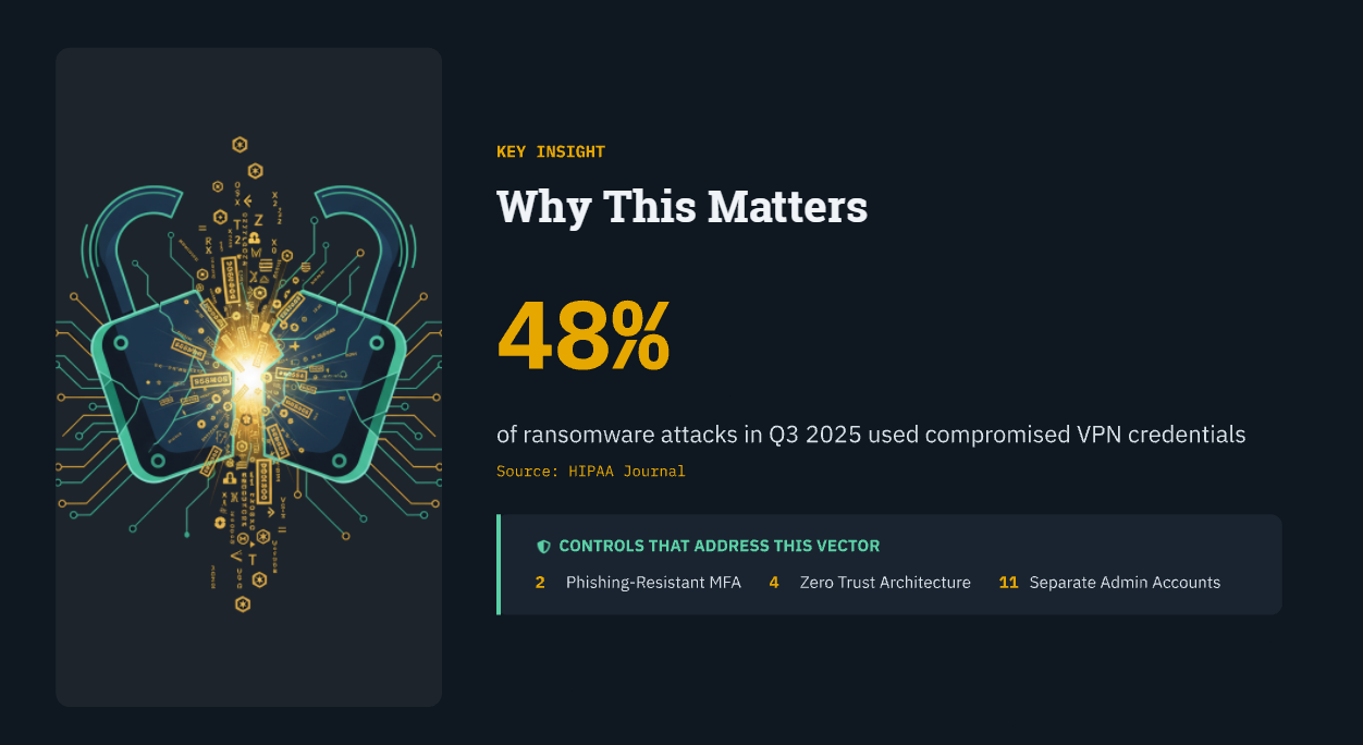 According to HIPAA Journal, compromised VPN credentials accounted for 48% of ransomware attacks in Q3 2025, up from 38% in Q2. This represents a fundamental change from earlier years when phishing dominated initial access.